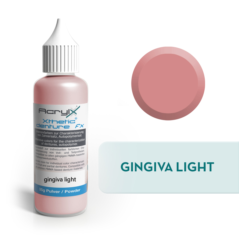 The intensive shades are used for the color characterization of the artificial gingiva in the fabrication of full and partial dentures. Due to the processing in the insertion technique by direct application into the silicone key or the duplicating form made of agar gel, a chemical bond is achieved with the used denture resin. Unlike stains, the natural color effect is much higher here, as the colors blend into one another.